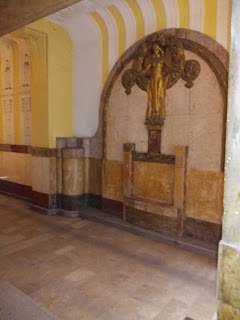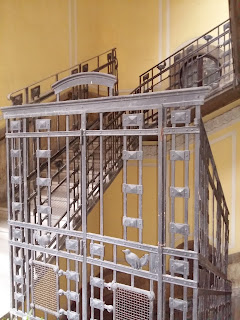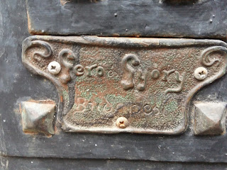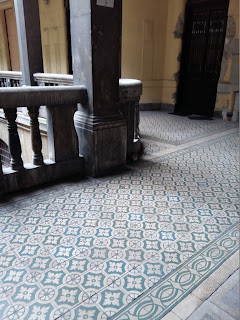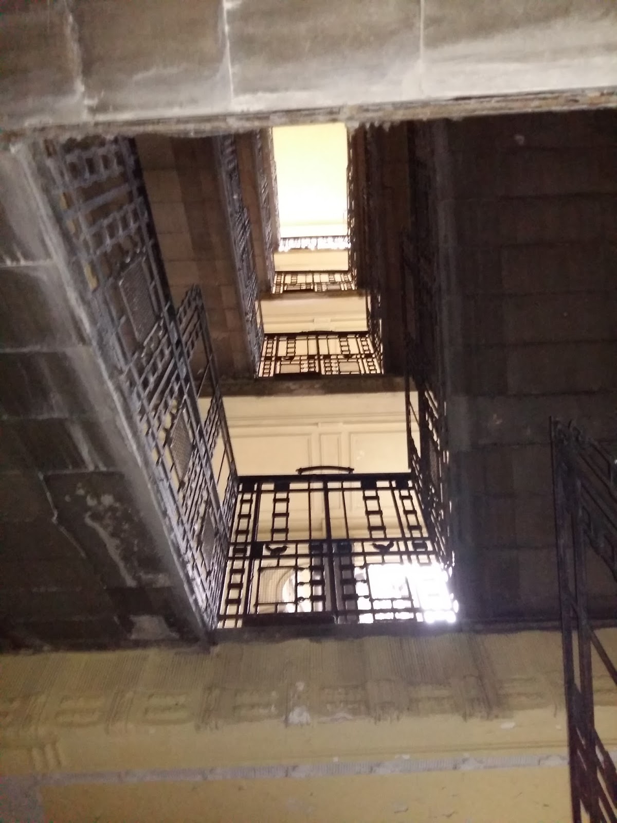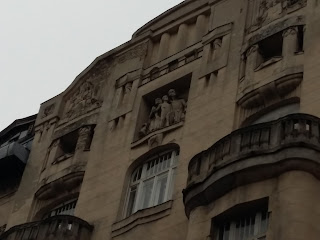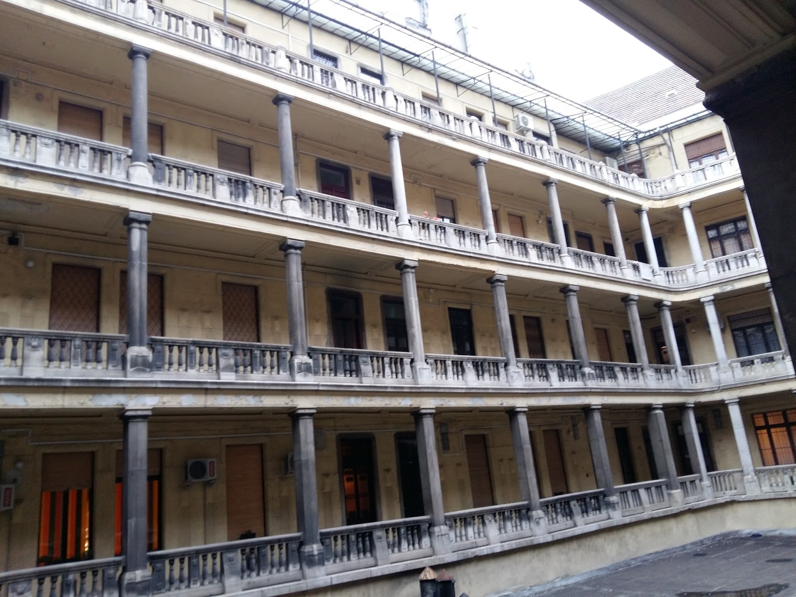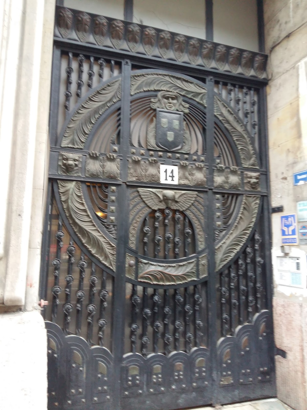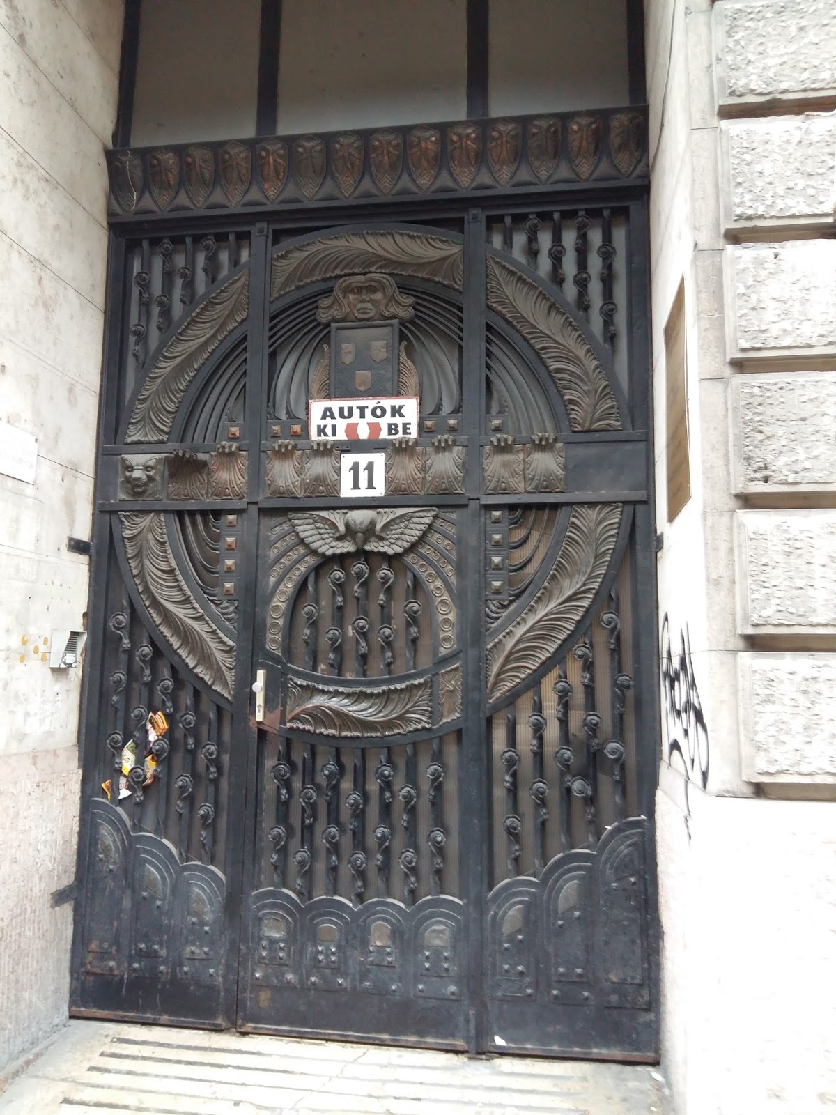 Kovácsoltvas, óriás kapu. Erre lettem figyelmes évekkel ezelőtt, amikor egyszer kocsival elsuhantam a Baross utca elején. Mindjárt a kanyar után, ahol reménytelen megállni, megcsodálni. Gyalog meg mindig rohan az ember. Aztán ma, a randa, szemerkélő ködben megközelítettem a csodát abban a reményben, tán megnyílik az ajtó, és megtudom, mit rejt. Nem tudom, mi hajtott arra, megkerüljem a tömböt, és megnézzem, van-e párja a homlokzatnak, nem átjáróház-e ez a szépséges kapujú és homlokzatú ház. Szégyen, nem szégyen, eddig nem hallottam soha erről a házról. És bingó. A Baross utca 11 és az Üllői út 14 bizony egy ház, átjáró fajta, meseszép szecessziós bérpalota (volt anno) nemes anyagokból, ragyogó, időtálló kivitelezésben. Az Üllői úton szerencsém volt, egy épp hazatartó kínai lány beengedett, így végig tudtam fényképezni ezt a gyönyörű házat.