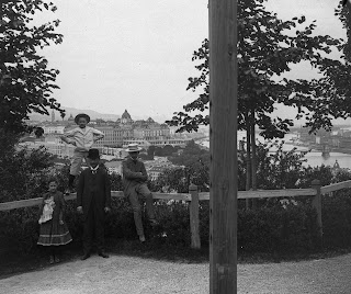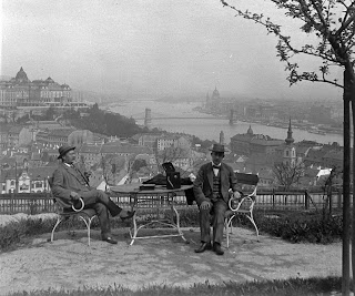 A kép baloldalán ülő Schoch úr ikervillát álmodott ide, a Gellért-hegy oldalába, meg is vette a fél hegyoldalt, hogy egy genovai, márványborítású villát másolva megszülessen az eredetihez képest szolid, várkastély-szerű nyaraló.