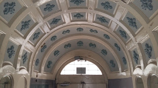 Kék virágok vártak a mennyezeten, kék, Zsolnay csempe a falon, hűvös és félsötét. A szűk előteret tükrök szélesítik, kis optikai csalással tágul a tér.