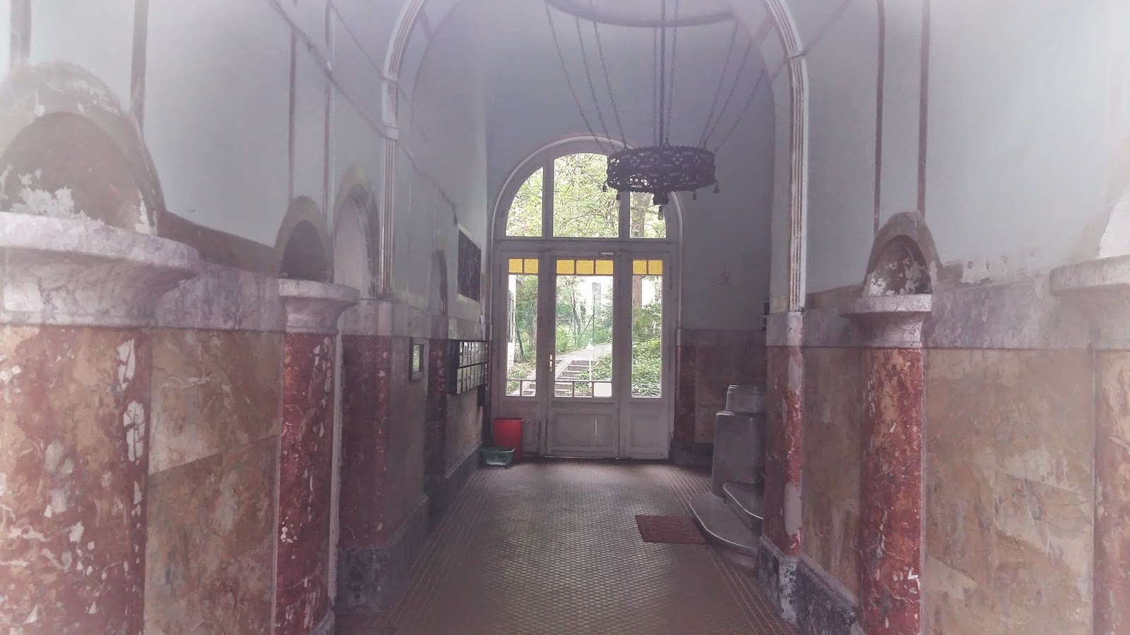 A bejárati ajtóra tapadva belül vélhetően eredeti, sárga keramit kockát, márványozott oldalfalakat, aranykeretes boltíveket, és egy hatalmas, háborúkat és ’56-ot csak a jóisten tudja, hogyan túlélt, kovácsoltvas csillárt csodálhat meg az ember.