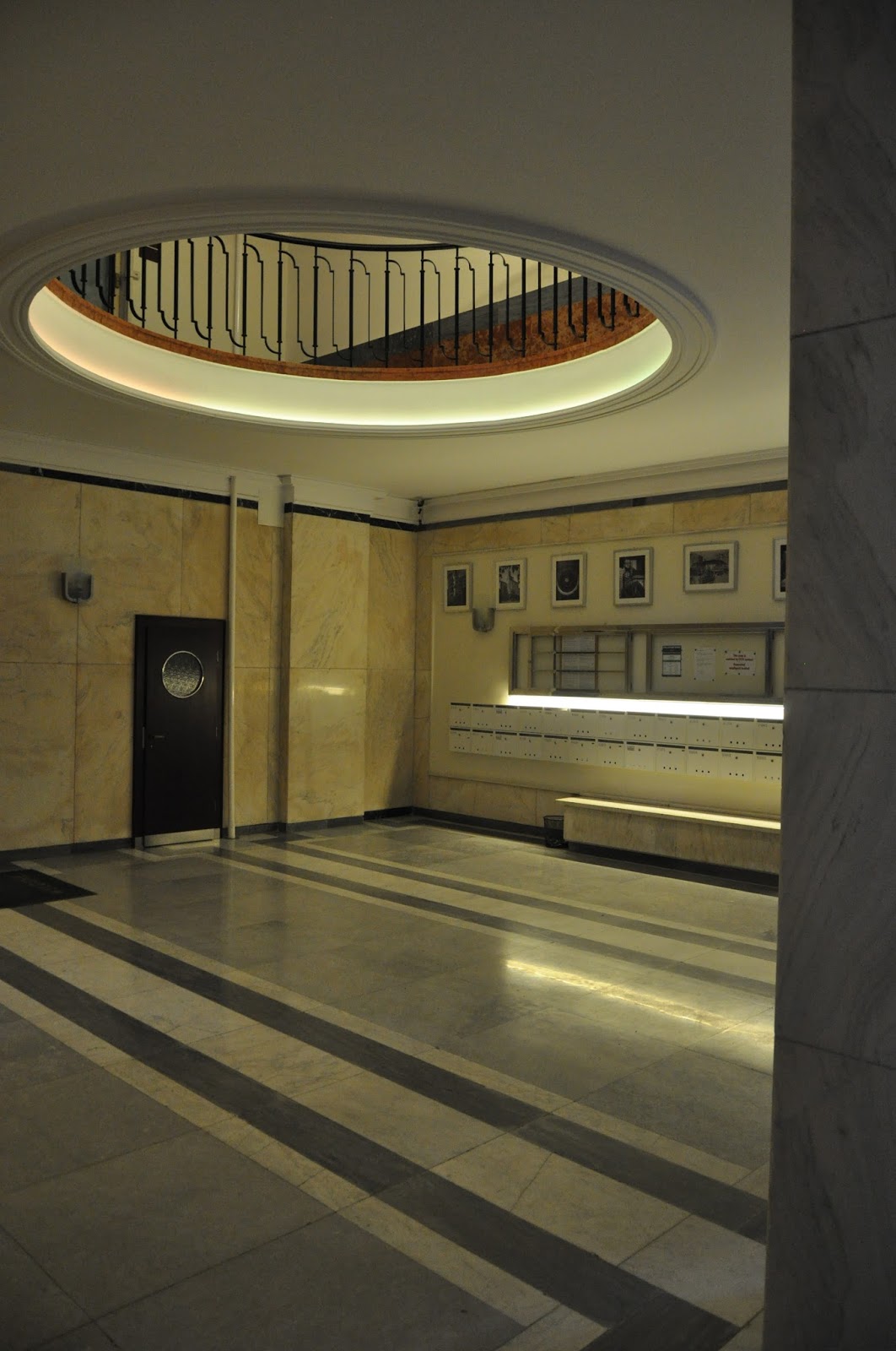A gyanútlan XXI. század eleji, a pesti koszhoz szokott látogató álla először az előcsarnokban esik le. Az ugyanis rózsaszín márvány. Szépségét – okosan – rejtett, finom világítás emeli az egyébként ronda, hetvenes évekből ismerős egyen-postaládák vonala fölött.