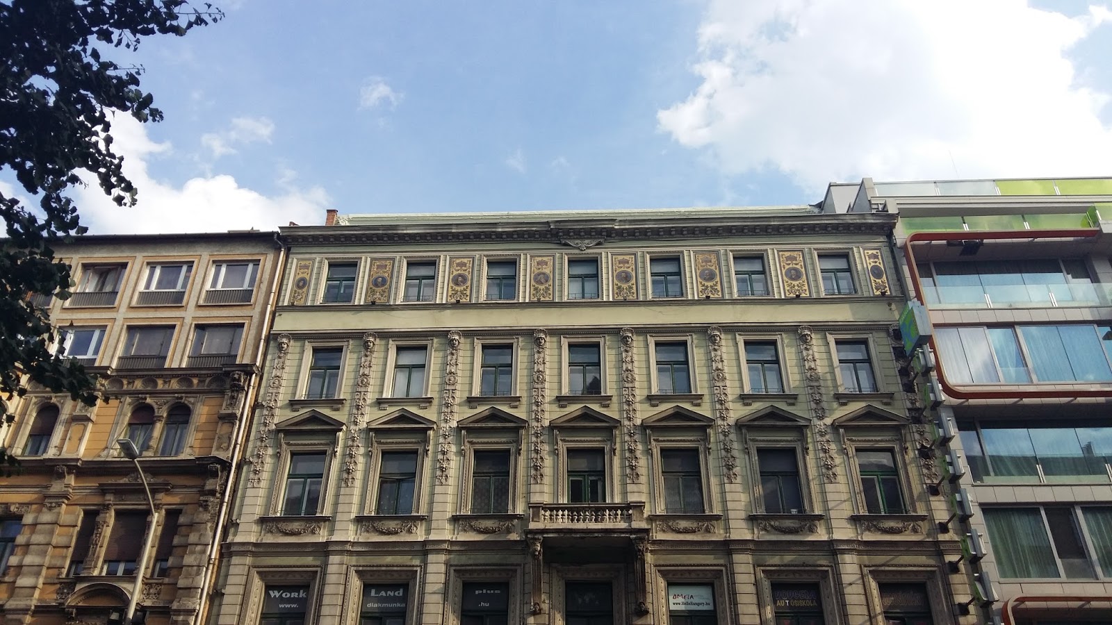 mozaiksoron. Megkoszosodott halványsárga homlokzat, eklektikus, „semmi-különös” bérház,